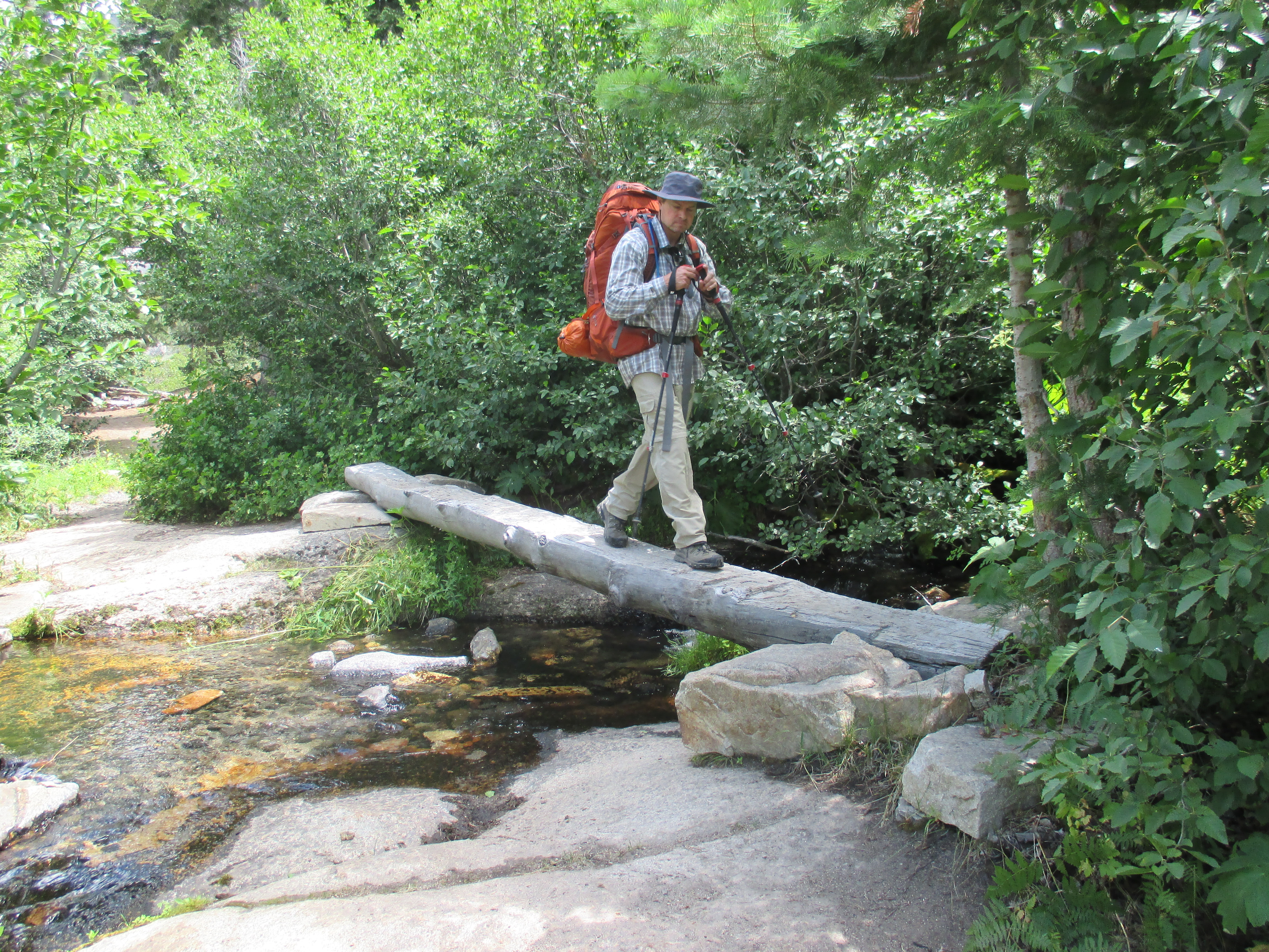 As we approach Island Crossing, Todd passes us. We later learn that Todd works for Red’s Meadow resort and is out for an overnighter. At Island Crossing, Rob and Maddy inform us that Iva Bell Hot Springs is only 3 easy miles away. We have just done 9 miles and told ourselves earlier that we were going to take it easy on the first day. But, it is still early enough and if the miles are easy, it will be well worth the effort. Iva Bell hot springs are natural hot springs that are approx. 12 miles out in the forest. It is a popular spot for hikers to soak their tired bodies after a long day on the trail.